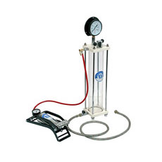 The apparatus consists of a pressure chamber which has a flanged top cap fitted with a 10Kg/Cm2. Pressure gauge and a valve for pumping in air. Water inlet and drain cock are fitted to the chamber. The foot pump supplied easily develops a pressure of 10Kg./Cm2 Complete with connecting pressure hose.