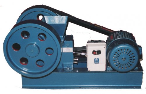 Two jaws of manganese steel are provided in the jaw crusher. The moveable jaw produces two blows for every revolution, thus reducing over sizing to a minimum. A combination of forward and downward and strokes with a rocking action exerts pressure on the coarse material to pass through the jaws. A hopper is provided at the top for feeding materials. The smooth jaws ensure a uniform product and easy cleaning is possible.