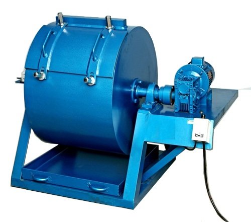 Consists of a hollow steel cylinder, closed at both ends, having an inside diameter of 700mm and inside length of 500mm. The cylinder mounted on a sturdy frame on ball bearings. The opening is closed dust tight with a removable bolted cover in place. A detachable shelf which extends through the drum catches the abrasive charge and does not allow it to fall on the cover. The drum is rotated at a speed of 30-33 RPM by an electric motor through a heavy duty reduction gear. Fitted with revolution counter and push button starter. Supplied complete with a tray for collection of the material. Abrasive charge consists of set of 12 Nos. cast iron spheres or steel spheres (hardened steel balls) approximately 48mm diameter each weigh between 390-445 gram. Complete as above.