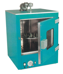 The unit is heavily insulated & has a double glass built in door for view inside temperature is controlled at 163'deg C #1'deg C. by means of a calibrated PID based DIGITAL TEMP. INDICATOR CONTROLLER.. inside platform rotated by external motor from 5 to 6 R.P.M. & 2 stainless steel pans are also provided to hold cups. (supplied without cups). Inner chamber made of stainless steel sheet of 304 grade & outer of mild steel sheet stoving painted. To work on 230 volts, AC 50 Hz supply.